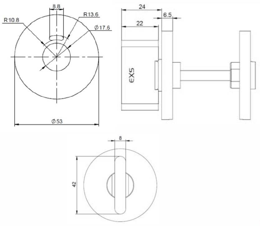 Ensemble condamnation - dé condamnation avec voyant série "Project". Finition inox brossé AISI 304, diamètre 53 mm, épaisseur 6,5 mm et carré de 6*6 mm.