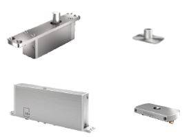 Ensemble pivots de porte complet "Système STM+C/TP70, offrant 1 fonction ferme porte avec freinage réglable à l'ouverture et blocage à 90° et -90°. Gâches rectangulaires au sol et au plafond.