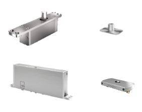 Ensemble pivots de porte complet "Système STM+D/TP70, offrant 1 fonction ferme porte avec freinage réglable à l'ouverture et blocage à 90° et -90°. Gâches rectangulaires au sol et au plafond.