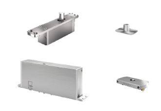 Ensemble pivots de porte complet "Système STM+G/TP70, offrant 1 fonction ferme porte avec freinage réglable à l'ouverture et blocage à 90° et -90°. Gâches rectangulaires au sol et au plafond.